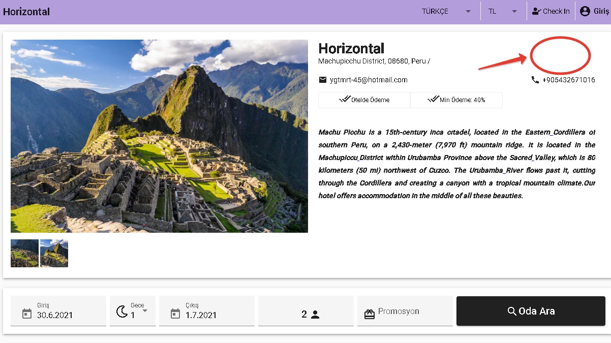 Otelinize ait çeşitli bilgilerin görünürlüğünü ayarlayabileceğiniz Otel Tanıtım Ayarları bölümünde örnek olması için Harita Göster kısmını iptal ettiğimizde, Booking sayfamızda otelimize ait bilgiler kısmında harita bilgisi görüntülenemeyecektir.