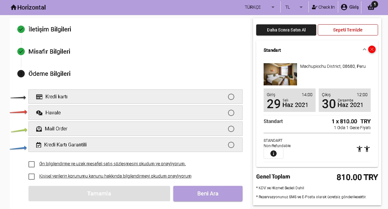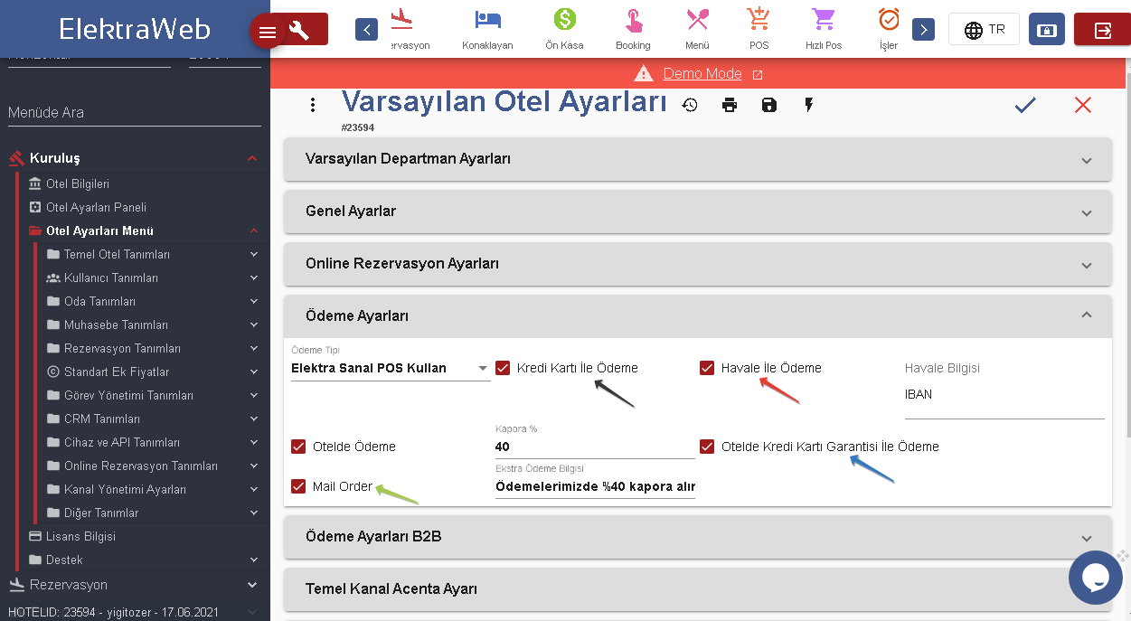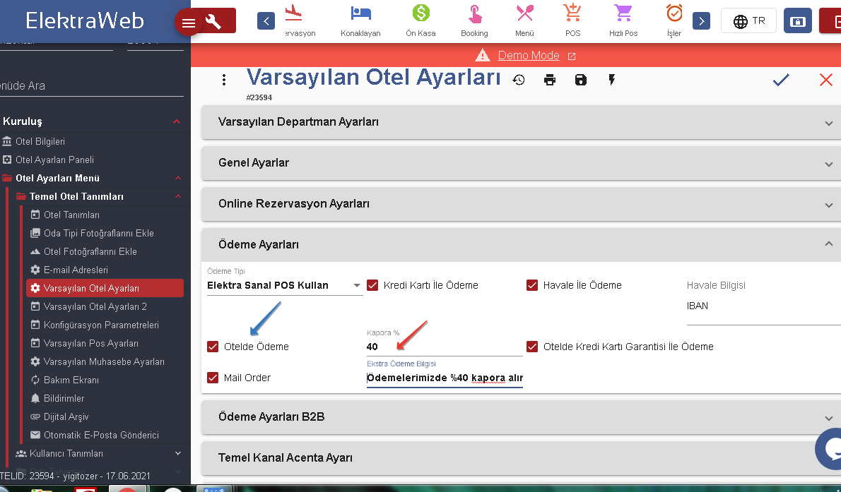 Ödeme ayarları kısmında, otelinizin müşterilerinize hangi tür ödeme olanakları sunduğunu belirtebilir ve müşterilerinizin istedikleri biçimde işlem gerçekleştirmesini sağlayabilirsiniz.Eğer ki kapora şartınız varsa oda fiyatının yüzdesi olarak belirleyebilir ve otelde ödeme olanağı varsa bu iki opsiyonun Booking otel bilgileri kısmında görünmesini sağlayabilirsiniz. Ödemeleriniz için kullanacağınız pos tipini “Ödeme Tipi”kısmından seçebilirsiniz. ”Ekstra Ödeme Bilgisi” alanına gireceğiniz bilgilendirme rezervasyon sonrası Voucher Belgesine yansıtılır.