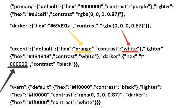 Göründüğü gibi bu renk kodlarıda ilgili butonların ve işaretlerin renklerini belirliyor.Kırmızı renkli ok butonun içindeki yazı renginin beyaz olarak tanımlandığını, sarı renkli ok buton renginin sarı olarak tanımlandığını, siyah renkli ok ise mause ile sarı renkli butonun üstüne geldiği zaman rengin sarıdan siyaha döndüğünü göstermektedir.